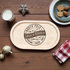 Wooden tray with 'North Pole Milk & Cookie Company' design on a wooden table with cookies and milk.